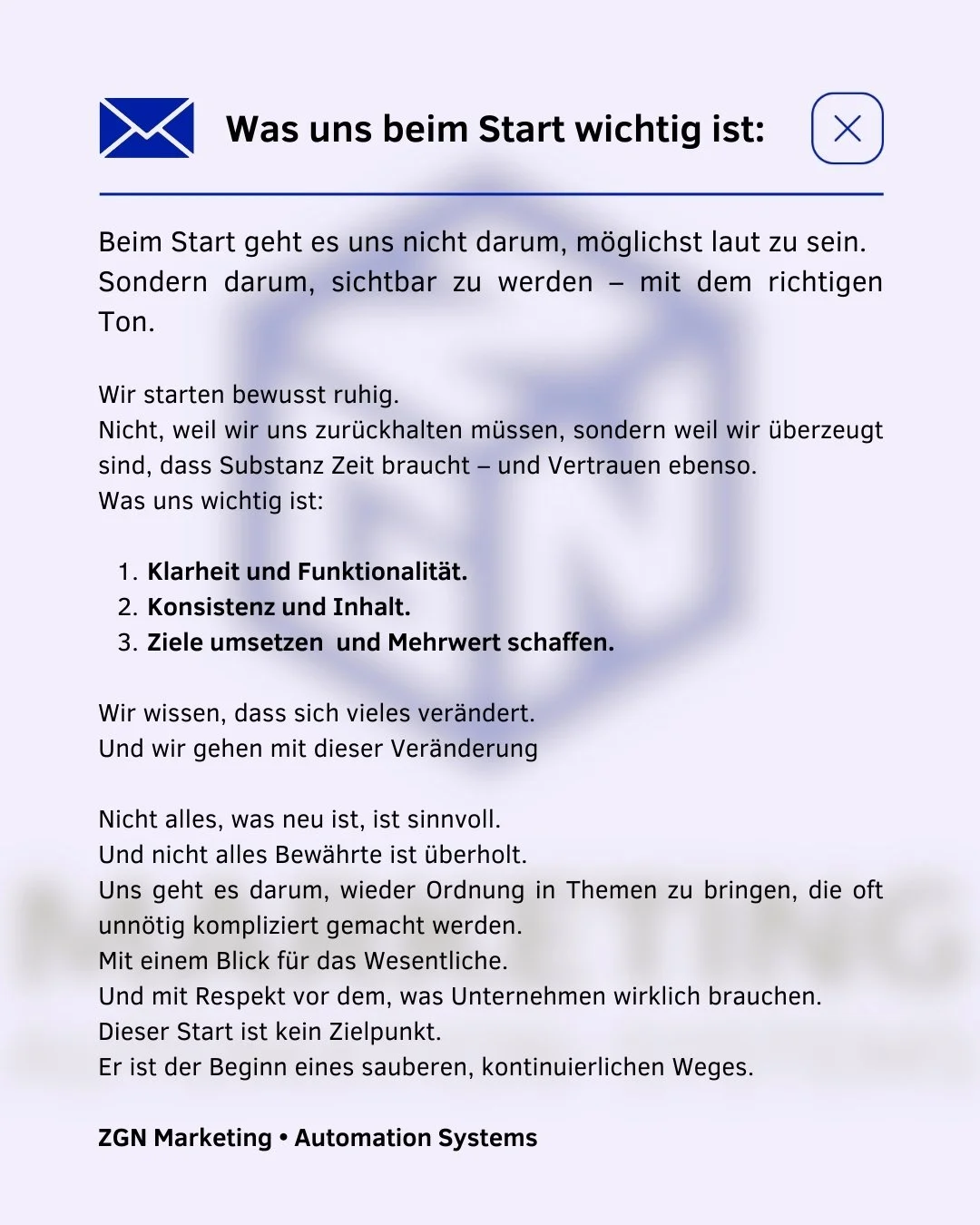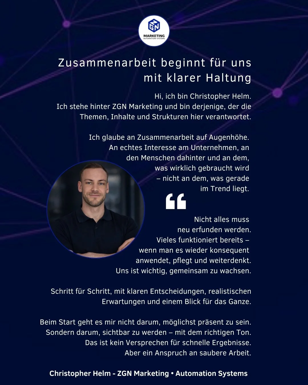 Der Druck nimmt zu: Anforderungen steigen, Systeme werden komplexer und Reichweite ist längst kein Selbstläufer mehr. Gleichzeitig fehlen Zeit, Fokus und oft auch die Kapazität, sich tiefgehend mit Automatisierung, Plattformlogiken und sauberen Abläufen zu beschäftigen. Genau hier setzt ZGN Marketing an. Mit dem nötigen Know-how, klarer Systemlogik und einem hohen Serviceanspruch entstehen Lösungen, die Komplexität reduzieren, Zeit zurückgeben und zuverlässig wirken – damit Aufwand nicht weiter wächst, sondern beherrschbar wird.